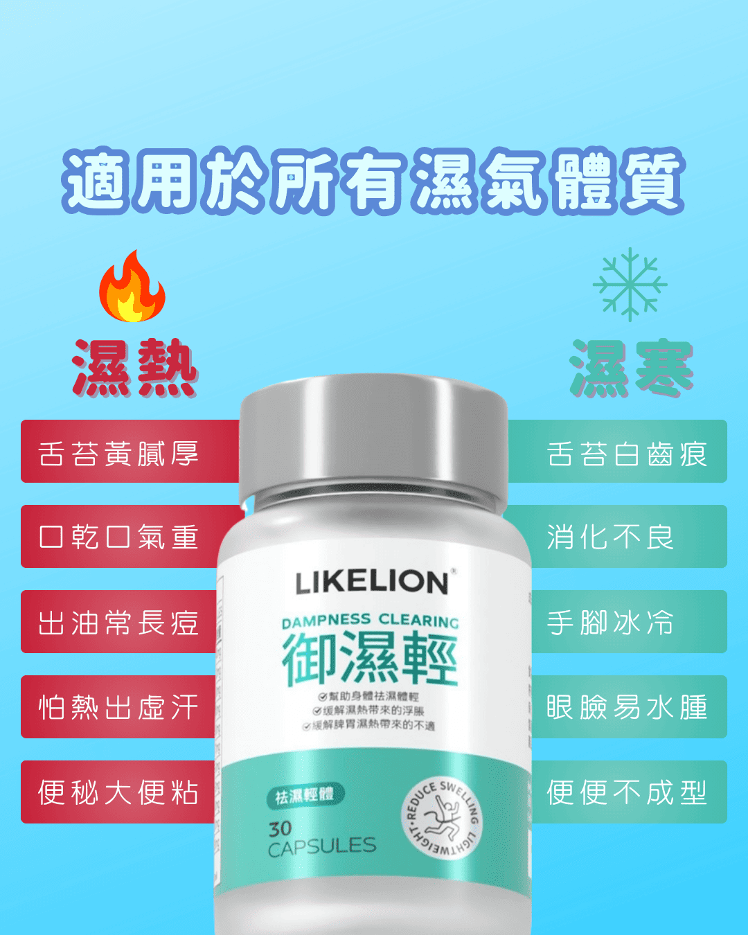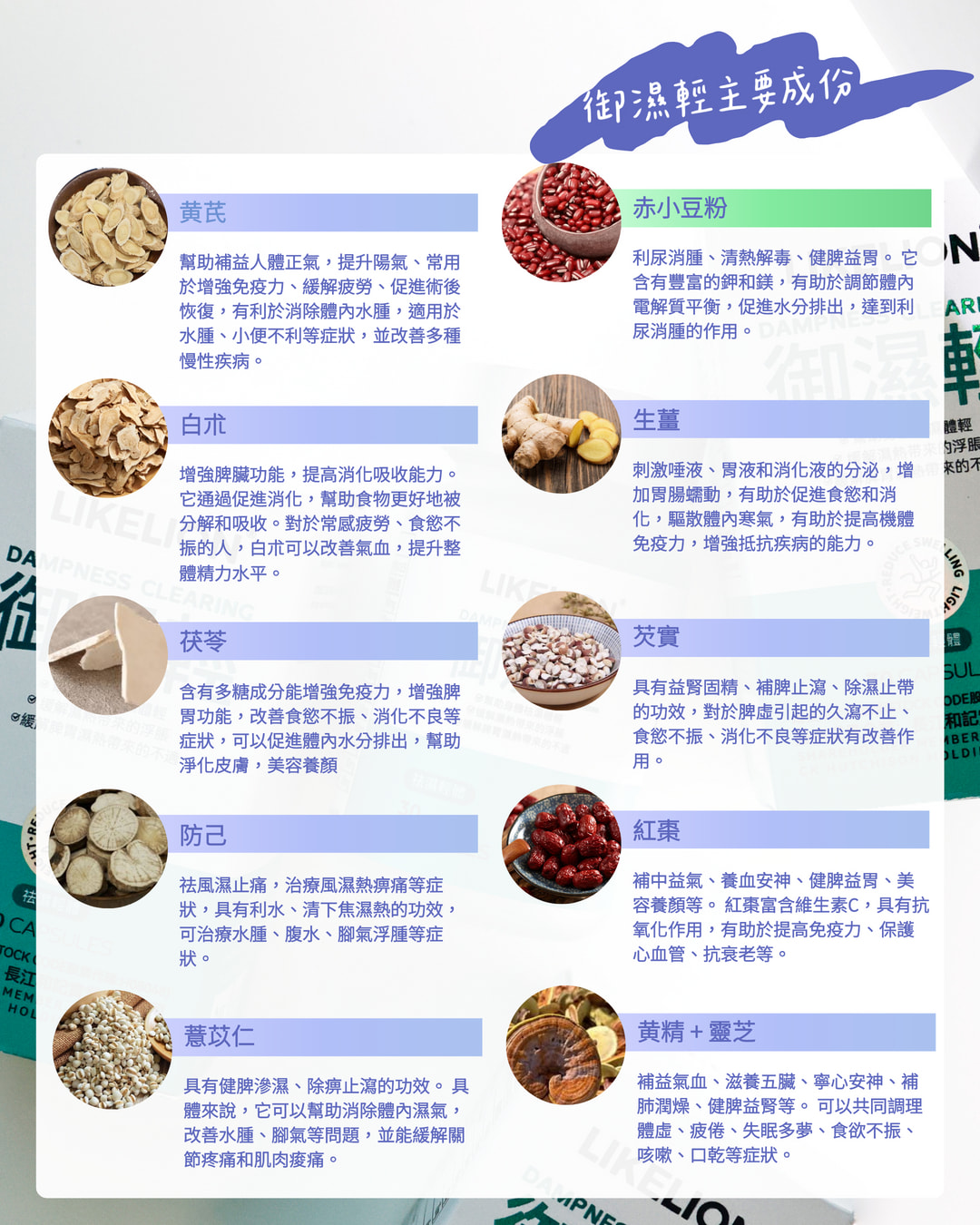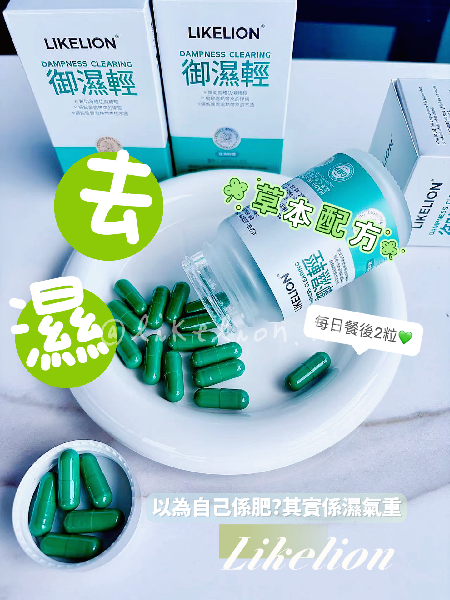 LIKELION 御濕輕 香港本地生產🇭🇰 蘊含多種珍貴天然中草本植物成分🌿 無論係濕熱或濕寒體質皆適用✅ 無濕一身輕 遠離濕重易腫體質👋 祛濕、健脾、消腫利水及排毒而設,調理脾胃健康,排水祛濕,清除濕邪,調理脾胃健康,排水祛濕,清除濕邪,全面祛濕排毒及調理 針對濕重倦怠,受水腫困擾,胃滯肚谷,皮膚困擾,脾胃較弱,感覺倦怠、氣脹身重等人士等都市問題,配方性質溫和📌 主要成分: 芡實 — 力氣充沛 健脾止瀉 白朮 — 健脾益氣 燥濕利水 赤小豆+薏仁 — 利尿消腫 解毒消腫 黃芪+紅棗+赤芝 — 補益氣血 調和諸藥 生薑 — 振奮脾陽 助藥力散佈 黃精 — 調理脾胃 補氣養陰 防己 — 利水消腫 祛風除濕 食用方法:每天1次,一次2粒,早餐或午餐後服用 1盒30粒,2盒60粒為1個月份量 價錢表: 2盒 $480(1個月份量) 6盒 $680(3個月份量) 18盒 $1700(9個月份量) 38盒 $3180(19個月份量) 98盒 $7280(49個月份量)