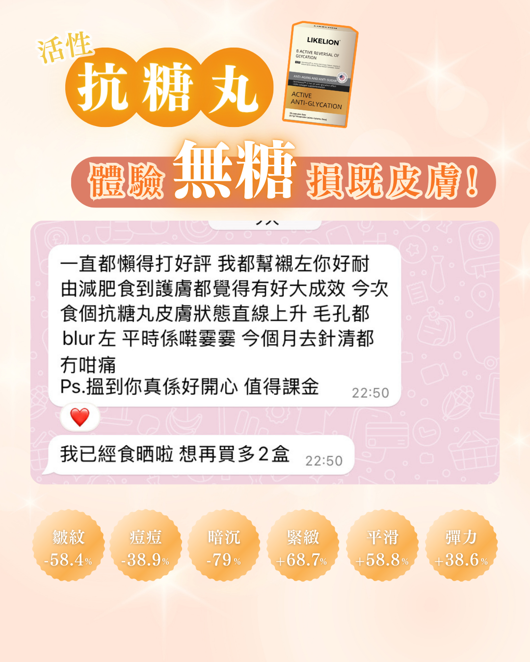 美國活性抗糖丸💊 8大維度進階抗糖抗老🥊 對抗肌膚糖化問題✨ 改善糖化引起的損傷反應🙅🏻‍♀️ 強效修護 有效改善膚質和彈性🧫 達致肌膚緊緻和通透效果🆙 📍📍6大維度顯著提升📍📍 皺紋 -𝟱𝟴.𝟰𝟯% 痘痘減少更控油 -𝟯𝟴.𝟵𝟯% 改善暗沉更煥亮 +𝟳𝟵% 緊緻 +𝟲𝟴.𝟳𝟯% 平滑度 +𝟱𝟴.𝟴𝟴% 彈力 +𝟯𝟴.𝟲𝟭% 🍀源頭狙糖 超高含量抗糖達88% 🍀糖氧雙抗 保護膠原蛋白達89% 🍀減少皮膚發紅抗敏感 専利成份Dermboost-2™:阻斷糖化AGES、鞏固肌膚屏障、提升肌膚自身修護力、激活膠原蛋白合成 複合型不老酵素 SOD B™ :有效減少糖氧化危機 因氧化應激的肌膚問題、減少褐素過多沉積、糖化導致的乾 / 紋 / 黄 糖鞘脂 + 磷脂:兩親性稀有脂質,可阻斷遊離糖黏附膠原蛋白 含神經醯胺:改善皺紋、減少黑色素沉澱、高效保濕、強化皮膚屏障、柔嫩彈潤、高效保濕 \同時我地可以改善糖化引起既損傷反應/以下係恐怖「糖化作用」 皮膚:皺紋﹑毛孔粗大﹑乾燥﹑膠原流失﹑鬆弛﹑暗沉無光澤﹑炎症誘發(濕疹 狼瘡 痘痘 出油)﹑雙頰下垂、眼紋和法令紋變得明顯﹑蠟黃﹑肌膚屏障受損﹑色斑等 身體 :肌肉減少﹑老化﹑增加動脈硬化的風險﹑糖尿病﹑肥胖﹑不孕﹑易累﹑減少骨骼強度﹑腎臟功能損傷等 服用方法: 35歲以下:每日1粒,隨餐或餐後溫水送服 35歲以上:每日2粒,隨餐或餐後溫水送服 周期建議:90粒(約3個月)為一個週期,效果更佳 1盒份量為:30粒 1盒 $399 3盒 $880 6盒 $1520 \抗糖抗氧美白快速SET/ 3盒抗糖丸+3盒美白飲 $1980 6盒抗糖丸+6盒美白飲 $3580 12盒點陣丸+6盒美白飲+6盒抗糖丸 $4780